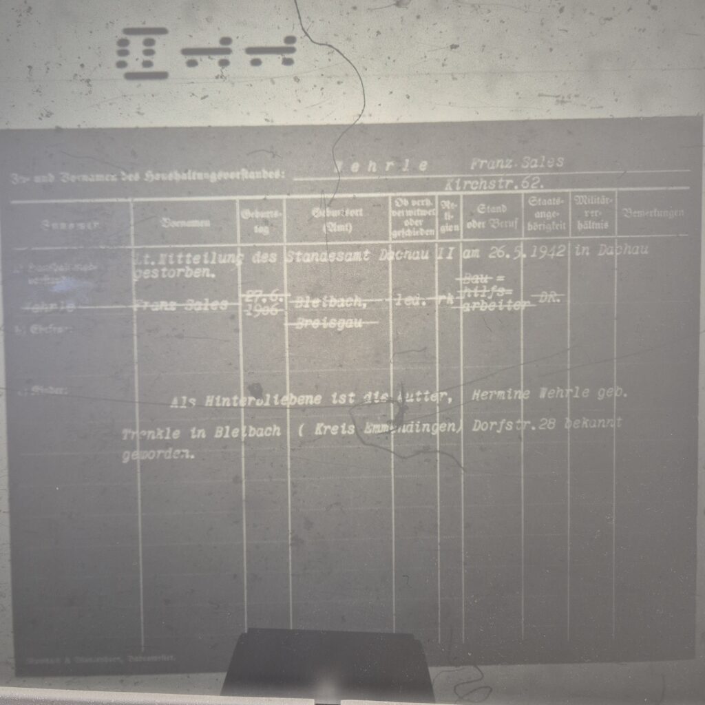 “Lt. Mitteilung des Standesamts Dachau II am 26.5.1942 in Dachau gestorben. Als Hinterbliebene ist die Mutter, Hermine Wehrle geb. Trendle in Bleibach (Kreis Emmendingen) Dorfstr. 28 bekannt geworden.”1
